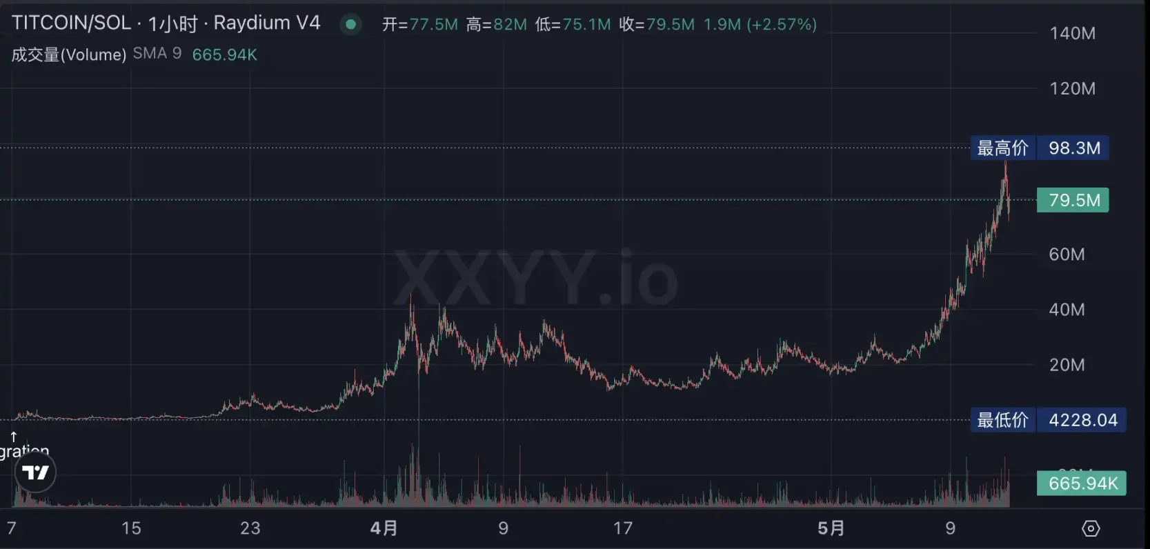 另外同樣亮眼的就是 COIN 類「仿盤」TITCOIN,這個十足的「陰謀盤」在初期憑借著「擦邊」維持著相當不錯的流量數據,而背後的資金一邊建設社區一邊活活在熊市拉出一個幾乎「只漲不跌」的盤面,從 3 月份到 5 月份累積了 22000 個持有者社區。