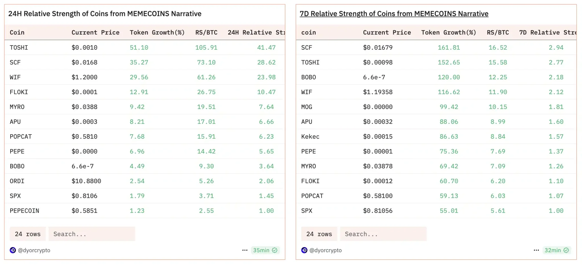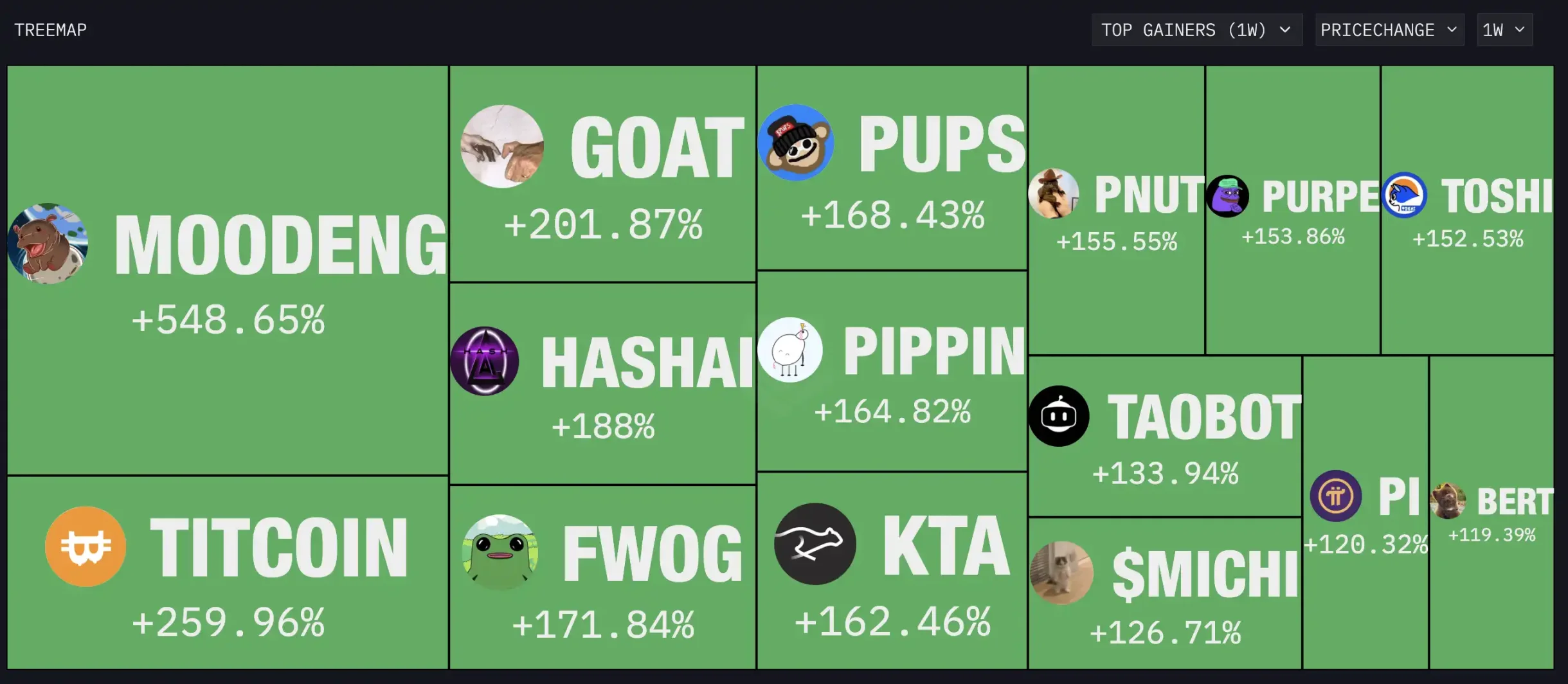按照 ARKHAM 的 TREEMAP 數據顯示,最近一周表現最好前 15 個代幣中有一半都是 Solana 的老 Memecoin,其中當屬 MoonDeng 與 PNUT 概念最火,知名 KOL 川沐對他購買這兩個代幣的邏輯是「他們很像早期的 pepe 和 shib」,而無論如何這兩個同時期的概念幣都在這個周期中表現出色。