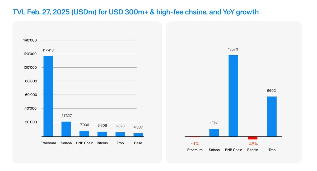 - Solana 的費用同比增長 3000%,TVL 同比增長 127%,領跑所有 L1;