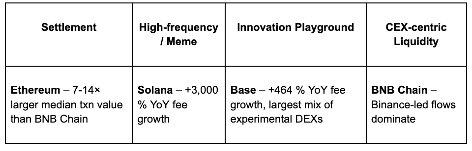 多鏈生態本質是一種分工體係。鏈抽象將成為獲勝的用戶體驗(UX)模式,錢包會話可以流暢地將訂單、餘額和身份路由到提供最佳延遲、成本和安全組合的任何後端,而無需要求用戶進行選擇。 當前,以太坊仍然是機構級結算層,但 Solana 正在迅速成為高頻、高參與度零售活動的首選鏈。從勢頭和增長的角度來看,以太坊面臨著迄今為止最強大的競爭壓力: