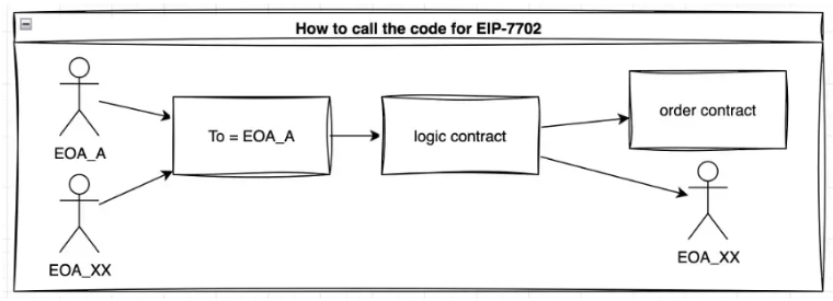 當你完成了設置,那麼當任何交易 To 地址指向你的時候,那將會和調用智能合約一樣,係統會將你原本設置的邏輯合約的代碼,「加載」到你當前 EOA 的狀態中去執行其邏輯。