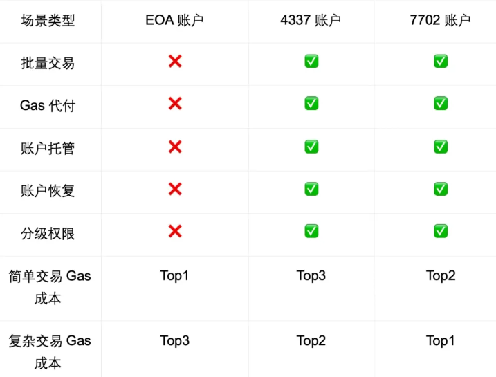 現在不妨我們用一張表格去體現 EOA、ERC-4337、EIP-7702 之間的最終效果層差異。