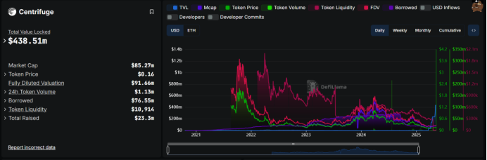 Centrifuge 是一個去中心化的現實世界資産融資協議,使借款人無需依賴傳統銀行或中介機構即可獲得融資。借款人可以通過將資産作為抵押,在 Centrifuge 上創建鏈上借貸池,從而獲得加密世界的即時流動性。該平台通過將整個私募信貸市場整合到鏈上,,建立了一個更加公開透明、資金成本更低、提供全天候流動性的去中心化金融體係(The Platform for Onchain Credit),有助於降低中小企業的融資成本,並為投資者提供與加密市場波動無關的穩定收益來源。Tinlake 是 Centrifuge 的核心協議,允許借款人將現實世界資産通過 NFT 形式進行抵押,並轉換為 ERC-20 代幣。當前其總鎖倉量(TVL)達到 2.5 億美元。