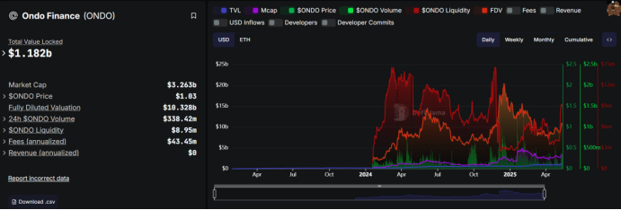 Ondo Finance 是一個現實世界資産(RWA)通證化的投資協議,致力於將美債、貨幣市場基金等低風險、穩定收益、可規模化的金融産品引入鏈上,從而為鏈上投資者提供更安全、穩定的替代資産。與傳統穩定幣不同,Ondo 的産品讓持有者而非發行方獲得底層資産的收益,實現了收益歸屬機制的轉變。截至 2025 年 4 月,Ondo Finance 的總鎖倉量(TVL)已突破 10 億美元,反映出市場對通證化美債等産品的強烈需求。