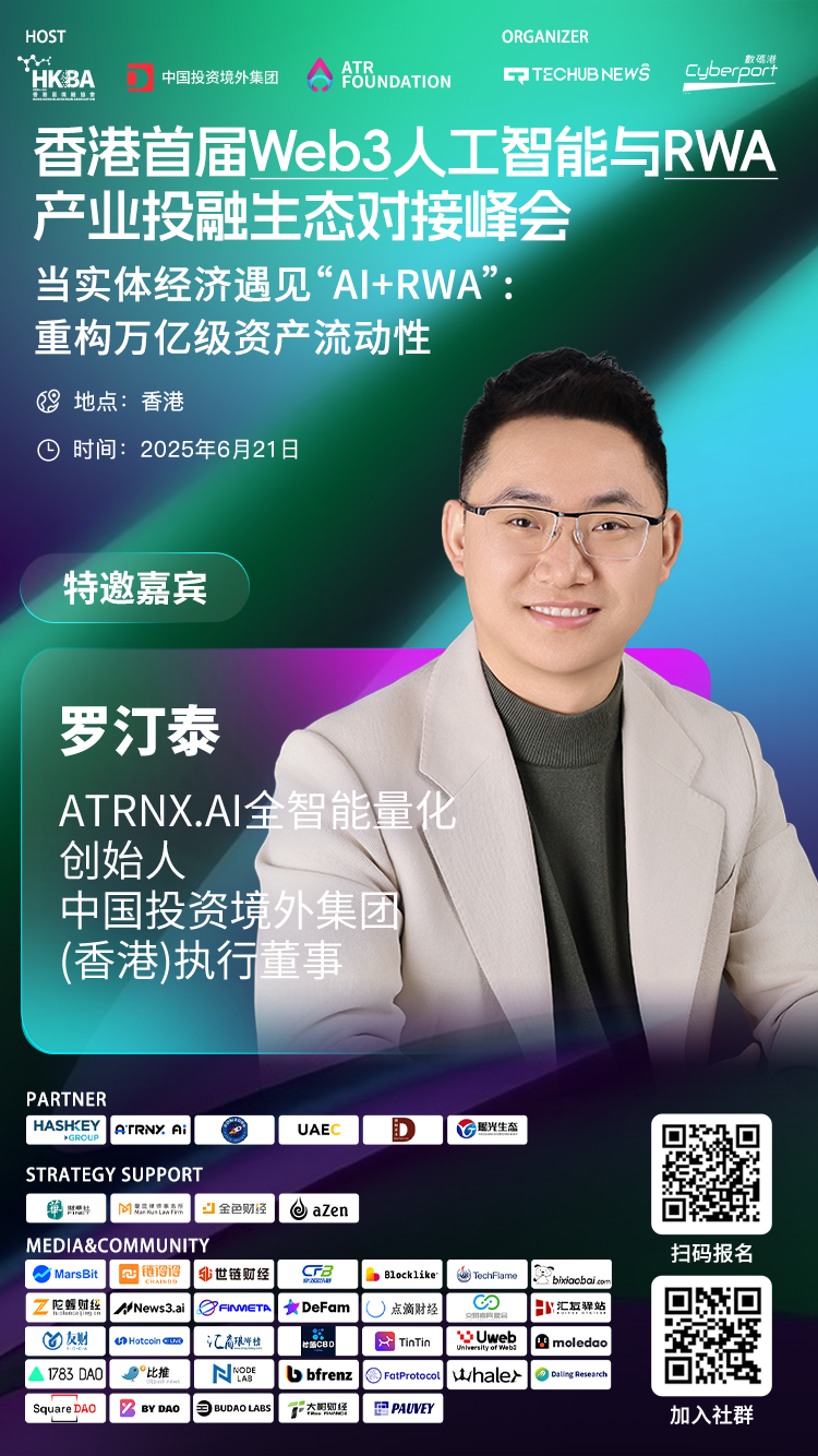 Techub News 消息,中國投資境外集團(香港)執行董事羅汀泰,確認將出席於 2025 年 6 月 21 日在香港舉辦的「香港 Web3 人工智能與 RWA 産業投融資生態對接峰會」。他將在峰會上以中國投資境外集團(香港)牽頭,並聯合 13 家資本和基金共同下場佈局 RWA 實體資産鏈上轉型,用資本力量促進國内外的《RWA 投融資標準白皮書》成型。