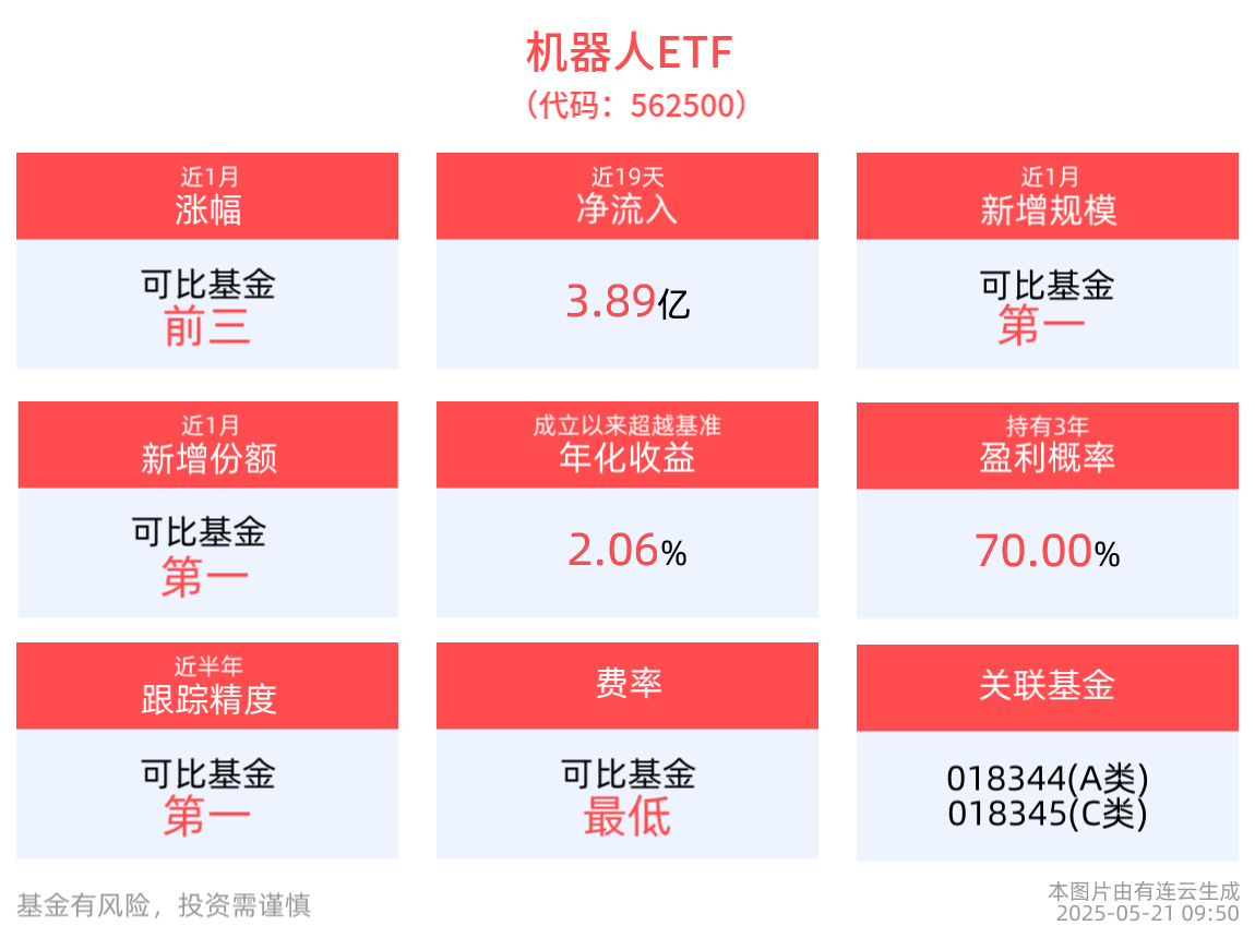 機器人ETF(562500),場外聯接(華夏中證機器人ETF發起式聯接A:018344;華夏中證機器人ETF發起式聯接C:018345)。