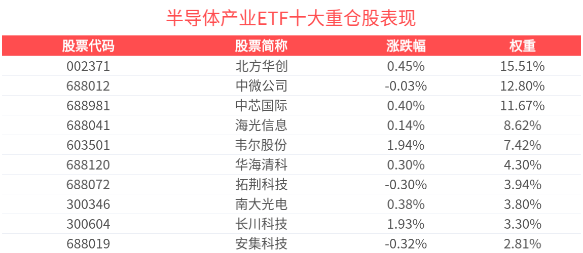 數據顯示,截至2025年4月30日,中證半導體産業指數(931865)前十大權重股分別為北方華創(002371)、中微公司(688012)、中芯國際(688981)、海光信息(688041)、韋爾股份(603501)、華海清科(688120)、南大光電(300346)、拓荊科技(688072)、長川科技(300604)、安集科技(688019),前十大權重股合計佔比76.35%。