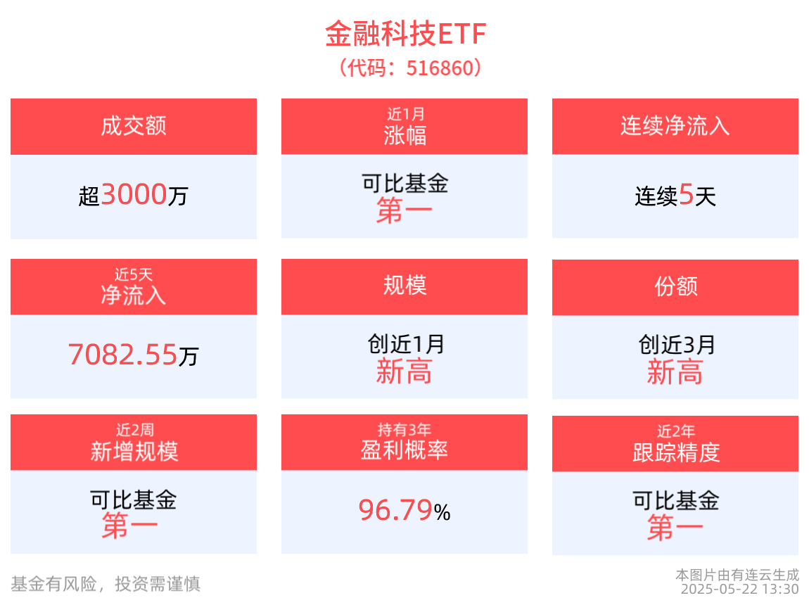 截至5月21日,金融科技ETF近1年淨值上漲59.32%,居可比基金第一,指數股票型基金排名44/2803,居於前1.57%。從收益能力看,截至2025年5月21日,金融科技ETF自成立以來,最高單月回報為55.92%,最長連漲月數為3個月,最長連漲漲幅為113.16%,上漲月份平均收益率為10.57%,年盈利百分比為66.67%,歷史持有3年盈利概率為96.79%。截至2025年5月21日,金融科技ETF成立以來超越基準年化收益為0.54%。