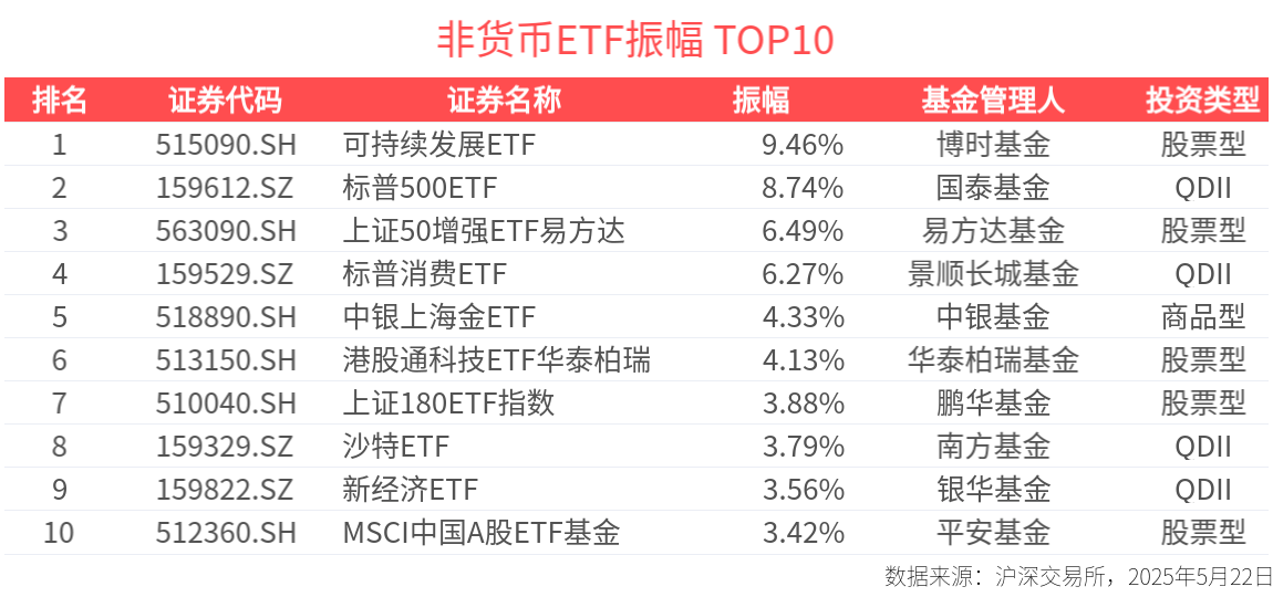 截至今日收盤,可持續發展ETF、標普500ETF、上證50增強ETF易方達振幅居市場前列,分別達9.46%、8.74%、6.49%。