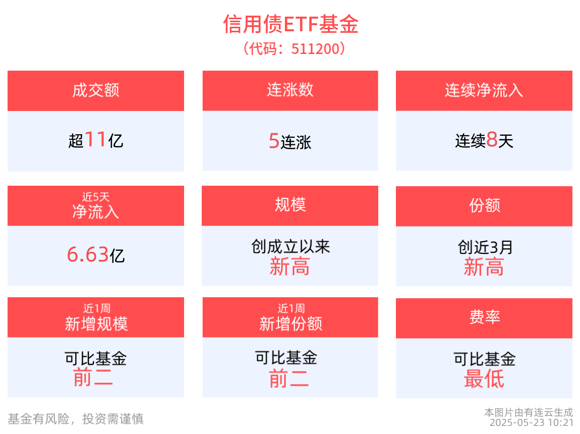 截至2025年5月23日10:20,信用債ETF基金(511200)上漲0.02%,沖擊5連漲。最新價報100.64元。