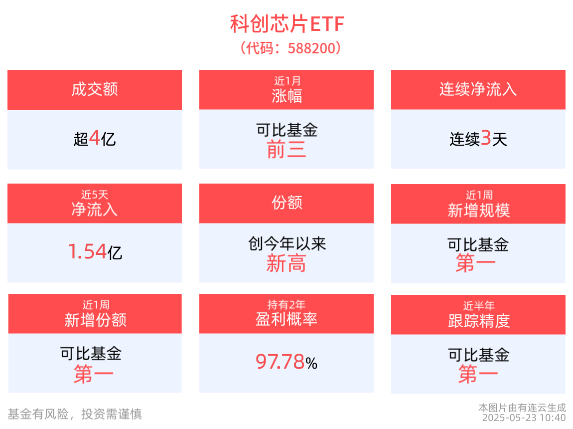 流動性方面,科創芯片ETF盤中換手1.76%,成交4.33億元。拉長時間看,截至5月22日,科創芯片ETF近1年日均成交22.31億元,排名可比基金第一。
