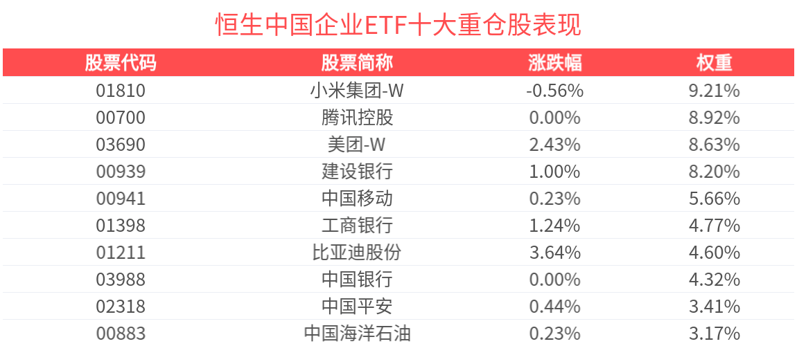 数据显示,截至2025年5月22日,恒生中国企业指数(HSCE)前十大权重股分别为小米集团-W(01810)、腾讯控股(00700)、建设银行(00939)、阿里巴巴-W(09988)、美团-W(03690)、比亚迪股份(01211)、中国移动(00941)、工商银行(01398)、中国银行(03988)、中国平安(02318),前十大权重股合计占比60.75%。