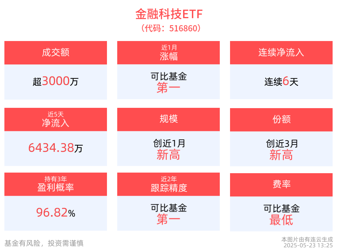 截至5月22日,金融科技ETF近1年淨值上漲56.95%,居可比基金第一,指數股票型基金排名37/2806,居於前1.32%。從收益能力看,截至2025年5月22日,金融科技ETF自成立以來,最高單月回報為55.92%,最長連漲月數為3個月,最長連漲漲幅為113.16%,上漲月份平均收益率為10.57%,年盈利百分比為66.67%,歷史持有3年盈利概率為96.82%。截至2025年5月22日,金融科技ETF近3個月超越基準年化收益為0.58%。