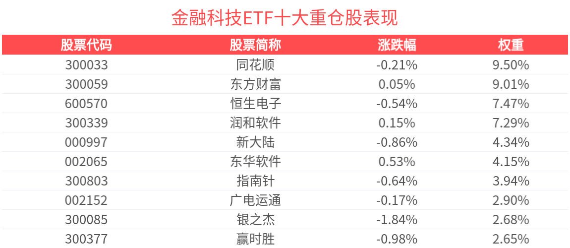 數據顯示,截至2025年4月30日,中證金融科技主題指數(930986)前十大權重股分別為同花順(300033)、東方財富(300059)、潤和軟件(300339)、恒生電子(600570)、新大陸(000997)、東華軟件(002065)、指南針(300803)、廣電運通(002152)、宇信科技(300674)、銀之傑(300085),前十大權重股合計佔比53.28%。