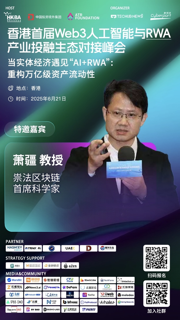 Techub News 消息,崇法區塊鏈首席科學家蕭疆教授確認將出席於 2025 年 6 月 21 日在香港舉辦的「香港 Web3 人工智能與 RWA 産業投融資生態對接峰會」。