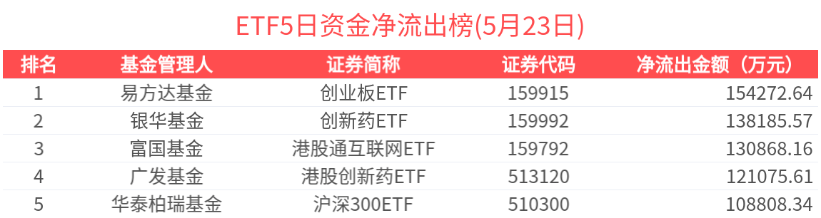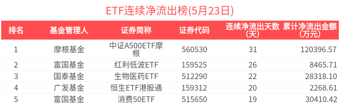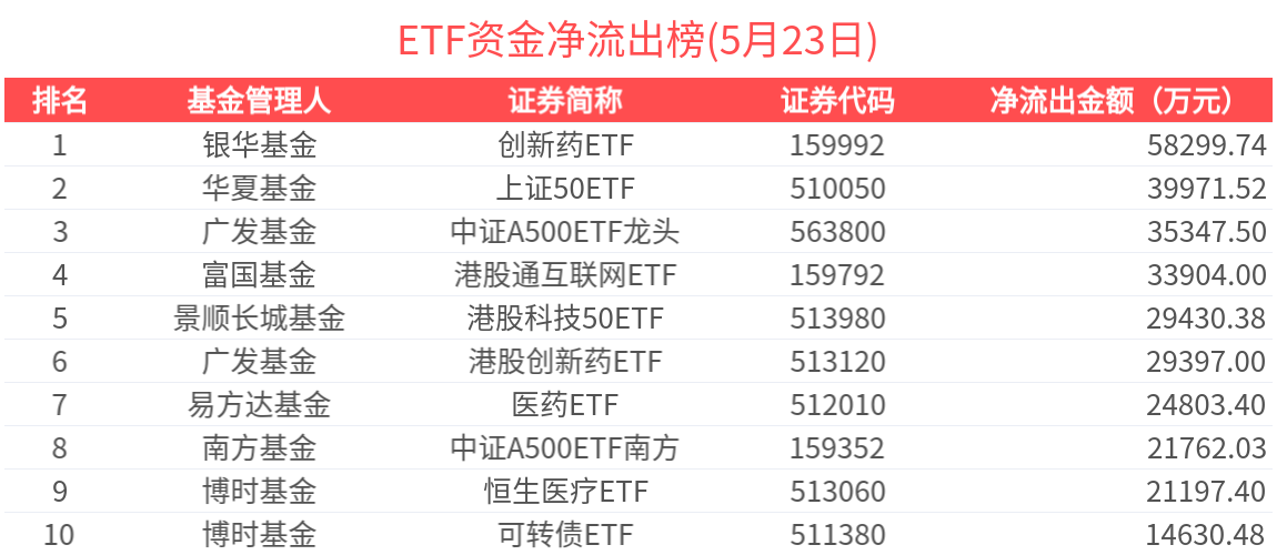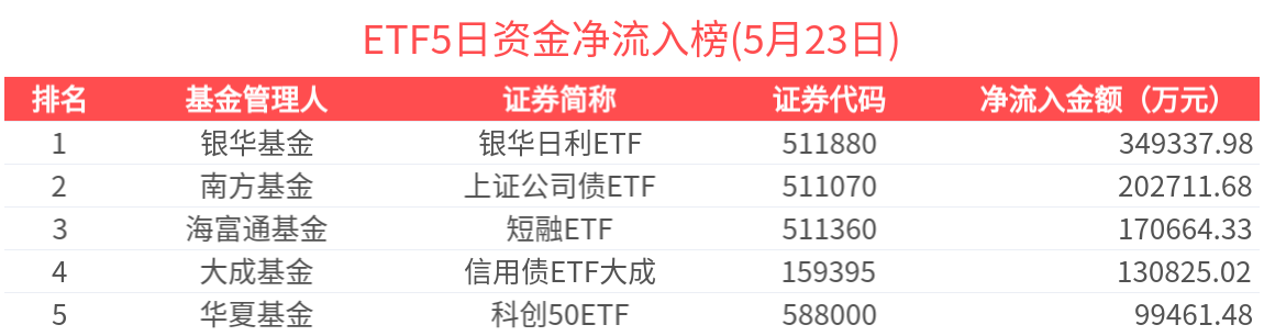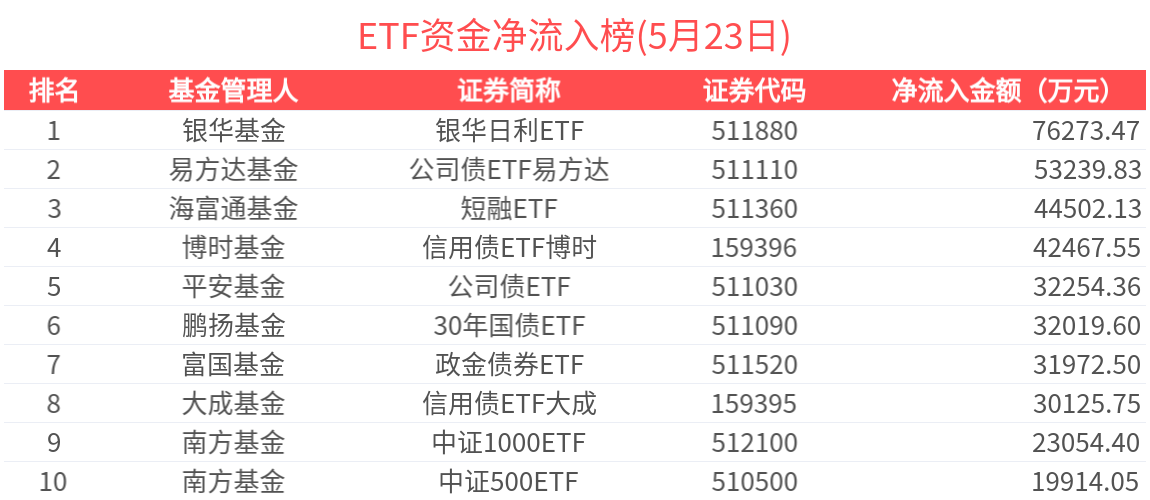 2025年5月23日共259只ETF基金獲資金淨流入,353只ETF基金淨流出。淨流入金額超1億元的有21只,銀華日利ETF(511880.SH)、公司債ETF易方達(511110.SH)、短融ETF(511360.SH)、信用債ETF博時(159396.SZ)、公司債ETF(511030.SH)資金顯著流入,分別淨流入7.63億元、5.32億元、4.45億元、4.25億元、3.23億元(淨申購份額*單位淨值)。