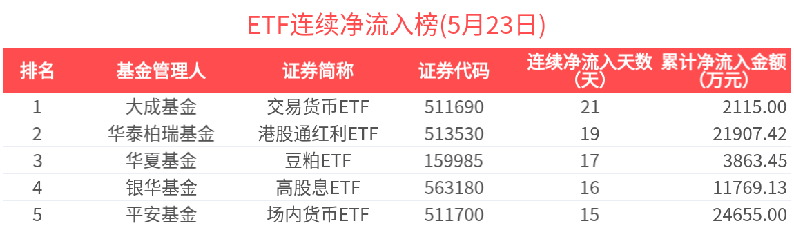 近期連續淨流入的ETF基金有142只,居前的為交易貨幣ETF(21天)、港股通紅利ETF(19天)、豆粕ETF(17天)、高股息ETF(16天)、場内貨幣ETF(15天),分別淨流入2115.00萬元、2.19億元、3863.45萬元、1.18億元、2.47億元。其中,港股通紅利ETF近19天加速流入,近19天累計流入2.19億元,基金規模快速增長至18.42億元。