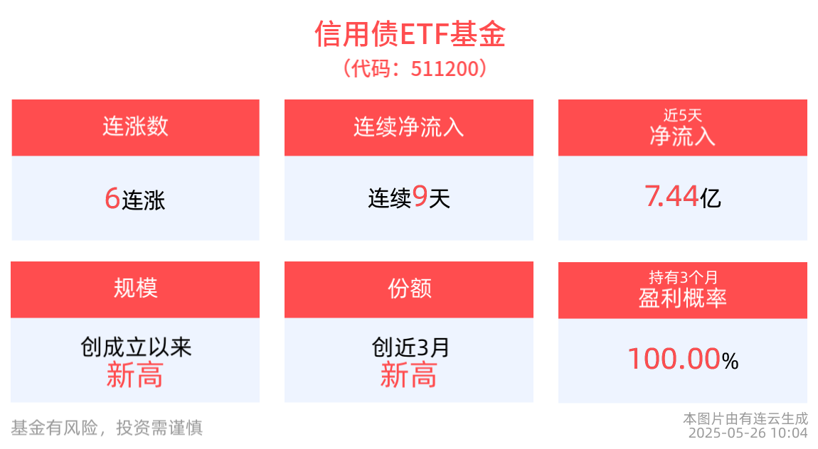 截至2025年5月26日10:04,信用債ETF基金(511200)上漲0.01%, 沖擊6連漲。最新價報100.66元。拉長時間看,截至2025年5月23日,信用債ETF基金近1周累計上漲0.27%,漲幅排名可比基金1/4。截至5月23日,信用債ETF基金近1周日均成交44.19億元。