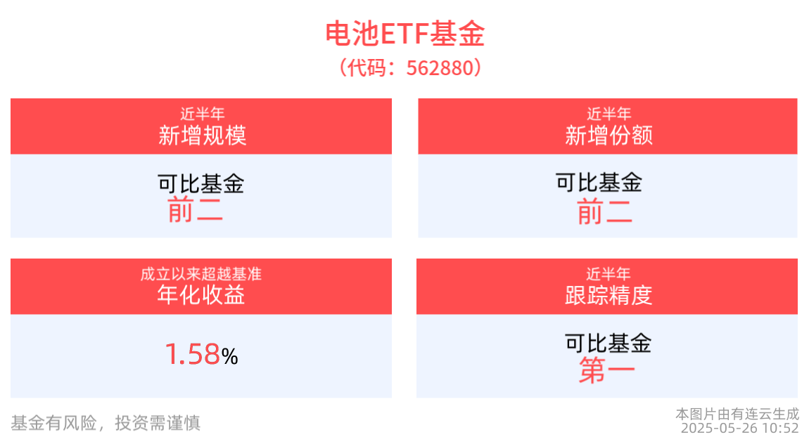 規模方面,電池ETF基金近半年規模增長1959.02萬元,實現顯著增長,新增規模位居可比基金前2。份額方面,電池ETF基金近半年份額增長9600.00萬份,實現顯著增長,新增份額位居可比基金前2。