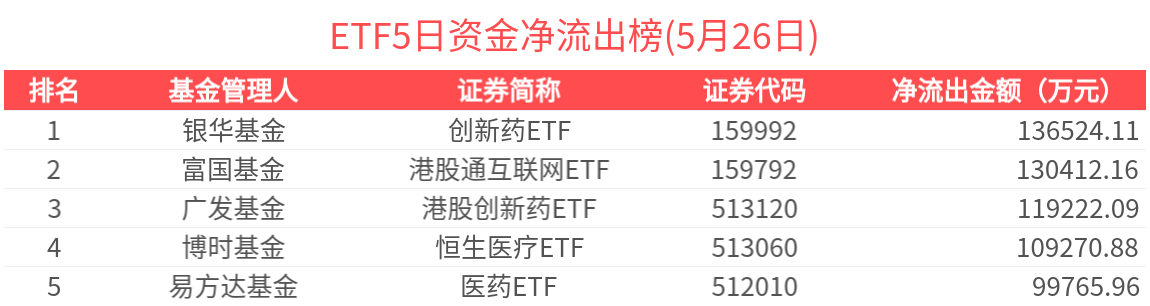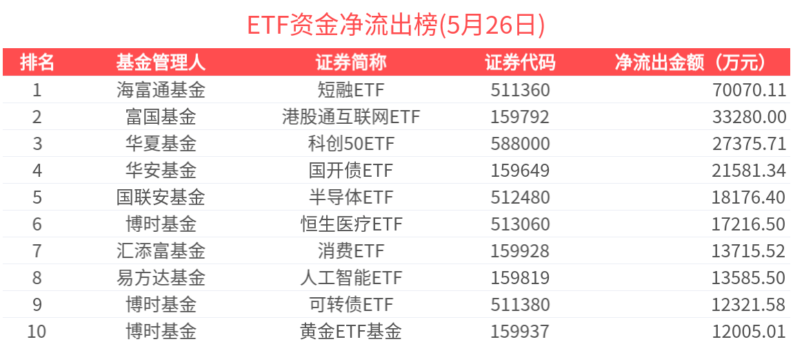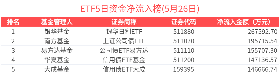 2025年5月26日共258只ETF基金獲資金淨流入,295只ETF基金淨流出。淨流入金額超1億元的有29只,滬深300ETF(510300.SH)、華寶添益ETF(511990.SH)、信用債ETF基金(511200.SH)、政金債券ETF(511520.SH)、上證50ETF(510050.SH)資金顯著流入,分別淨流入16.16億元、11.65億元、7.98億元、7.24億元、6.76億元(淨申購份額*單位淨值)。