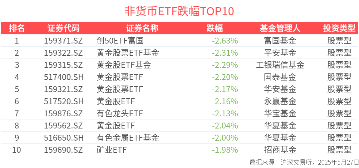 截至今日收盤,全市場共計802只非貨ETF下跌,下跌比例達71%。寬指方面,創業板50指數今天表現靠後,下跌0.82%;行業主題指數方面,中證細分有色金屬産業主題指數、中證有色金屬礦業主題指數跌幅居前,分別下跌2.05%、1.99%。