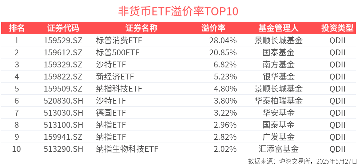 截至今日收盤,標普500消費精選指數溢價居前,標普消費ETF收盤溢價28.04%;標普500指數情緒高漲,標普500ETF收盤溢價20.85%。