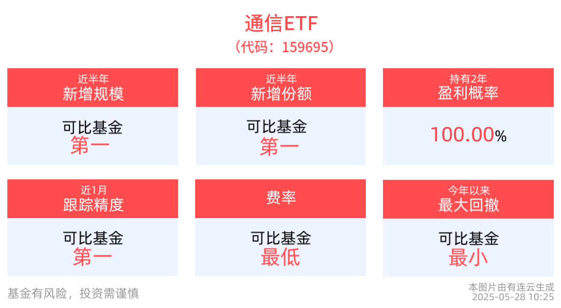規模方面,通信ETF近半年規模增長1265.55萬元,實現顯著增長,新增規模位居可比基金第一。份額方面,通信ETF近半年份額增長1300.00萬份,實現顯著增長,新增份額位居可比基金第一。