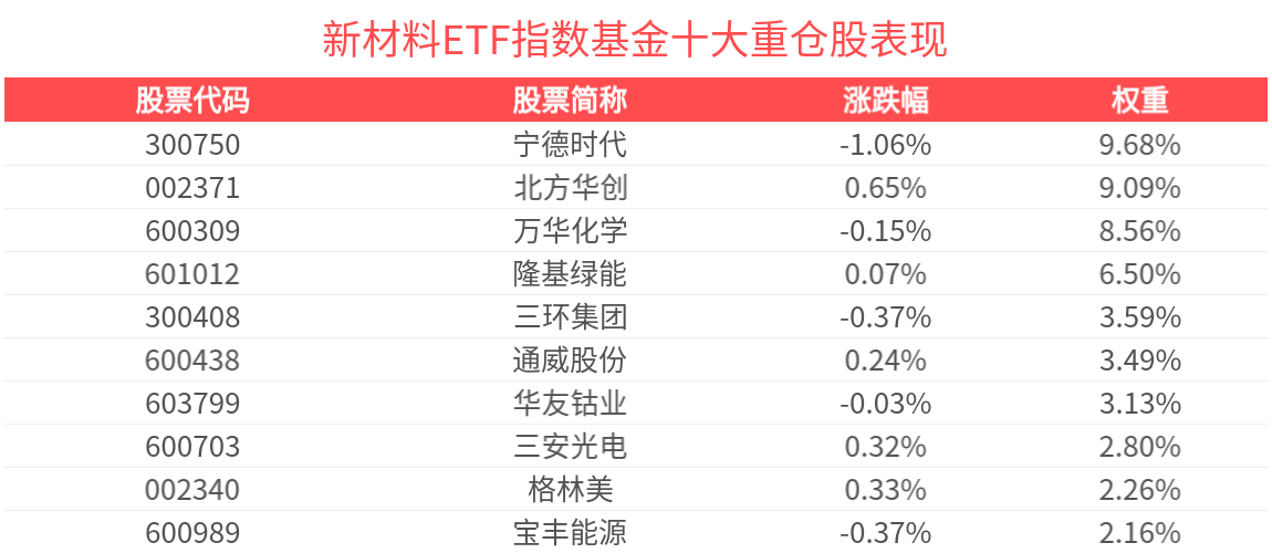 數據顯示,截至2025年4月30日,中證新材料主題指數(H30597)前十大權重股分別為北方華創(002371)、寧德時代(300750)、萬華化學(600309)、隆基綠能(601012)、三環集團(300408)、華友钴業(603799)、通威股份(600438)、三安光電(600703)、寶豐能源(600989)、格林美(002340),前十大權重股合計佔比52.71%。