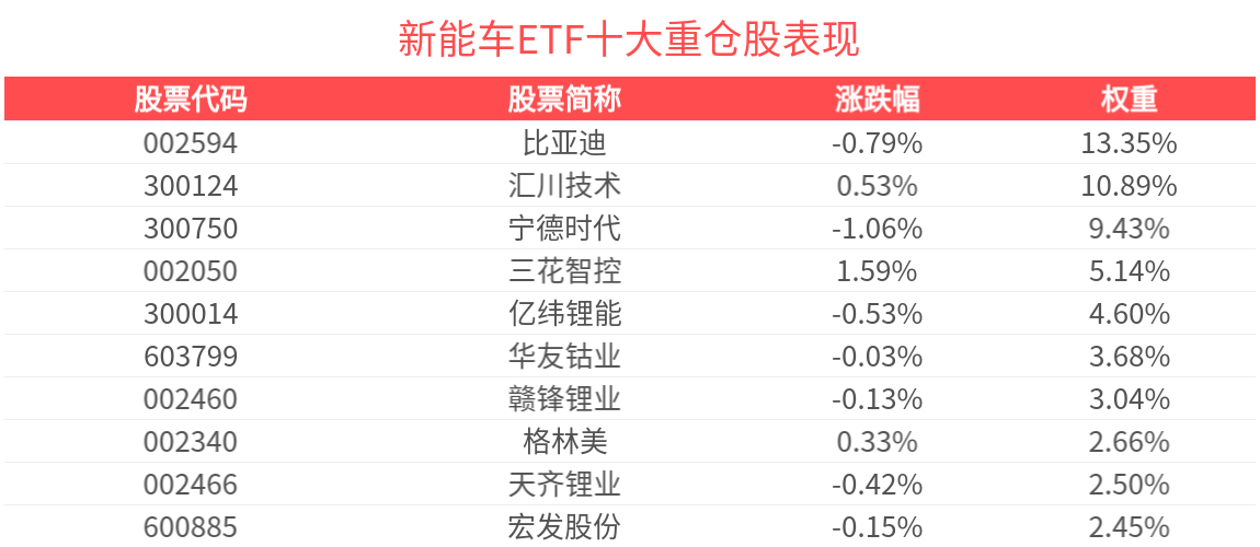 數據顯示,截至2025年4月30日,中證新能源汽車産業指數(930997)前十大權重股分別為比亞迪(002594)、匯川技術(300124)、寧德時代(300750)、三花智控(002050)、億緯鋰能(300014)、華友钴業(603799)、贛鋒鋰業(002460)、格林美(002340)、天齊鋰業(002466)、宏發股份(600885),前十大權重股合計佔比58.64%。