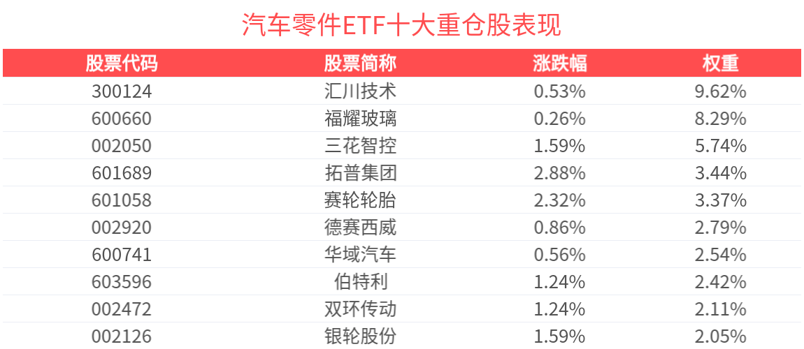 汽車零件ETF緊密跟蹤中證汽車零部件主題指數,中證汽車零部件主題指數從滬深市場中選取100只業務涉及汽車係統部件、汽車内飾與外飾、汽車電子、輪胎等領域的上市公司證券作為指數樣本,反映汽車零部件主題上市公司證券的整體表現。