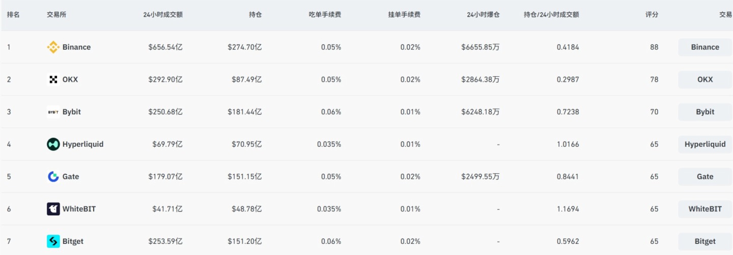 自 2020 年起,CEX 就以合約期貨為切入口,逐步重構了原先以現貨交易為主導的市場格局,結合 Coinglass 最新數據會發現,過去 24 小時,前五大 CEX 合約期貨 24 小時交易量均已經達到百億美元級別,頭部的幣安更是突破 600 億美元。