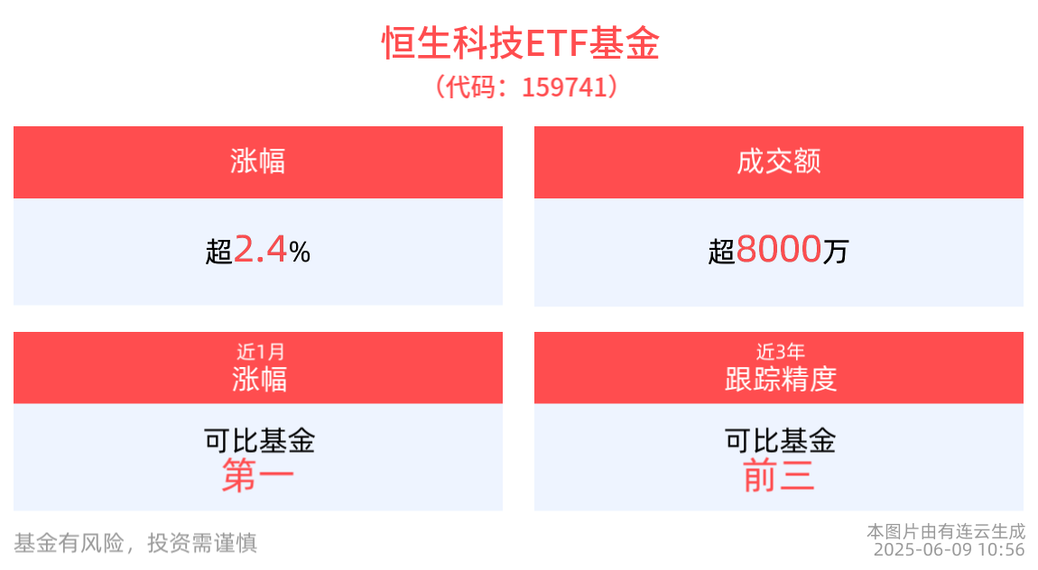 截至2025年6月9日 10:56,恒生科技指數強勢上漲3.02%,成分股金蝶國際上漲7.45%,騰訊音樂-SW上漲6.98%,快手-W上漲6.68%,商湯-W、美團-W等個股跟漲。恒生科技ETF基金(159741)上漲2.42%。