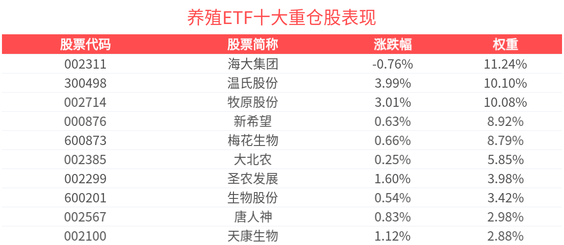 數據顯示,截至2025年5月30日,中證畜牧養殖指數(930707)前十大權重股分別為海大集團(002311)、牧原股份(002714)、溫氏股份(300498)、新希望(000876)、梅花生物(600873)、大北農(002385)、聖農發展(002299)、生物股份(600201)、天康生物(002100)、唐人神(002567),前十大權重股合計佔比68.9%。