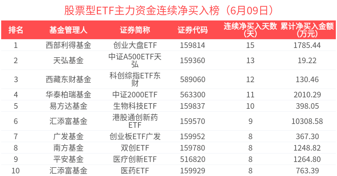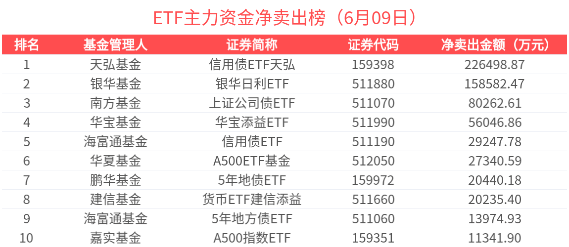 2025年6月9日,共350只ETF基金獲主力資金(單筆成交額100萬元以上)淨買入,165只ETF基金遭主力資金淨賣出。主力資金淨買入金額超1千萬元的ETF基金有141只,信用債ETF基金(511200), 信用債ETF大成(159395), 公司債ETF易方達(511110), 0-4地債ETF(159816), 公司債ETF(511030)受到主力資金青睐,分別獲淨買入41.05億元, 29.49億元, 17.00億元, 14.81億元, 14.06億元。