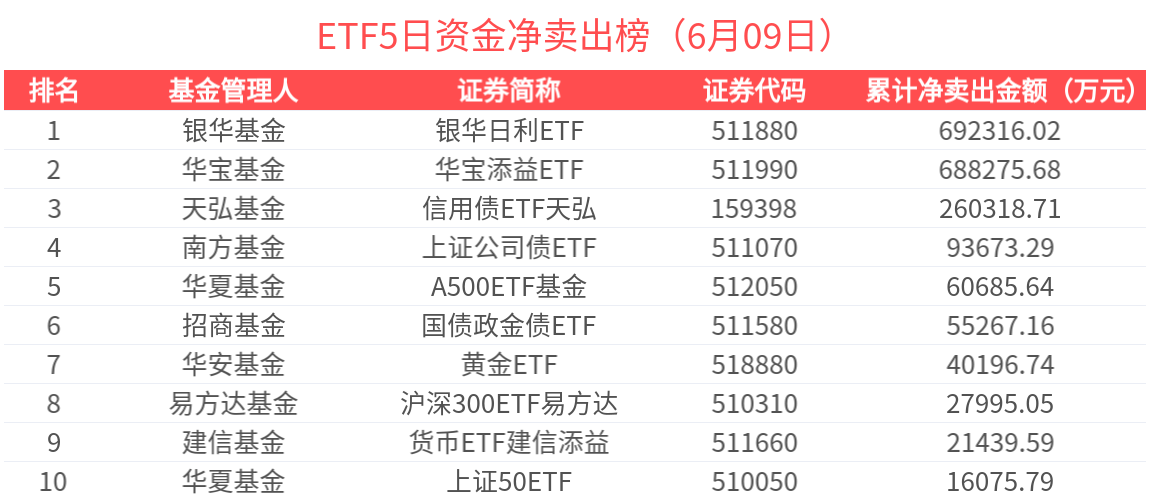 近5天主力資金累計淨賣出超過1億元的ETF基金有15只,金額居前的為銀華日利ETF(511880), 華寶添益ETF(511990), 信用債ETF天弘(159398), 上證公司債ETF(511070), A500ETF基金(512050)分別淨賣出69.23億元, 68.83億元, 26.03億元, 9.37億元, 6.07億元。其中,銀華日利ETF近5天遭主力資金大幅淨賣出。