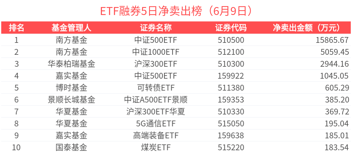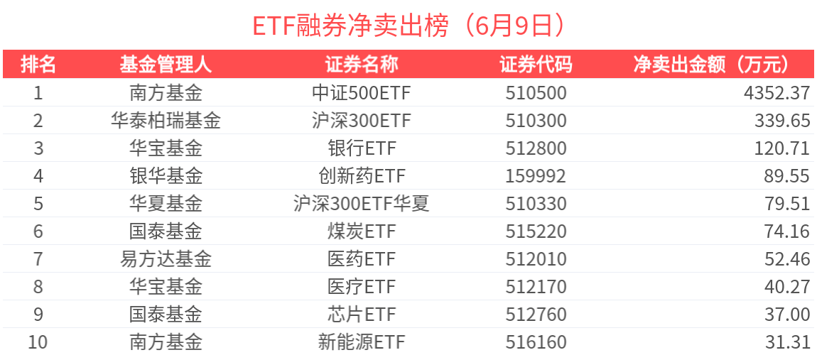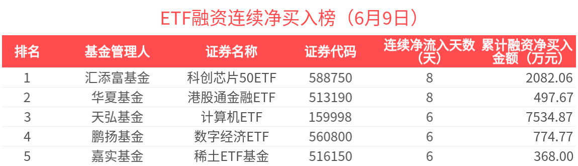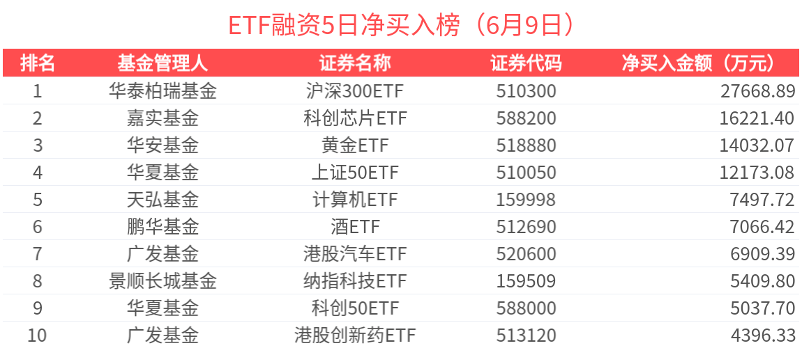 2025年6月9日,共237只ETF基金獲融資淨買入,34只ETF基金融券淨賣出。融資淨買入金額超500萬元的有52只,滬深300ETF(510300.SH)、上證50ETF(510050.SH)、科創50ETF(588000.SH)、黃金ETF(518880.SH)、科創芯片ETF(588200.SH)槓桿資金顯著流入,分別淨流入2.87億元、1.23億元、1.07億元、1.04億元、9094.70萬元。