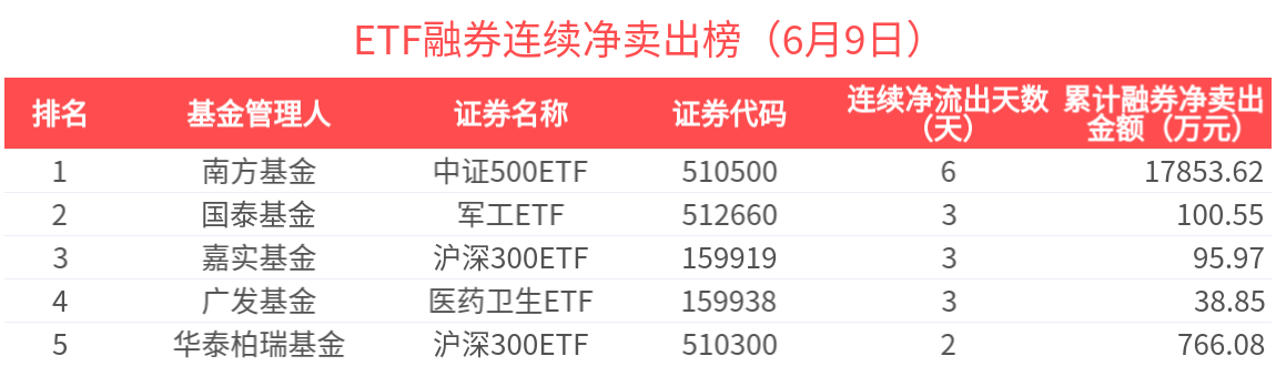 近期獲槓桿資金連續融券淨賣出的ETF基金有12只,居前的為中證500ETF(6天)、軍工ETF(3天)、滬深300ETF(3天)、醫藥衛生ETF(3天)、滬深300ETF(2天)等,分別淨賣出1.79億元、100.55萬元、95.97萬元、38.85萬元、766.08萬元。其中,醫藥衛生ETF近3天獲槓桿資金加速流出,近3天槓桿資金累計流出38.85萬元。