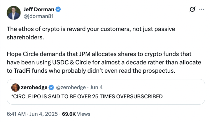Circle 作為 USDC 穩定幣的發行方,其 IPO 本應成為加密行業邁向主流金融的重要裡程碑,然而此次發行過程卻在加密圈内引發了廣泛爭議。Arca 首席投資官 Jeff Dorman 在本文中以親歷者的視角,對 Circle 在 IPO 配售中傾向傳統金融機構、忽視加密原生參與者的行為進行了強烈批評,並借此探討了「利益一致」這一加密行業核心理念為何在傳統 IPO 體係中屢遭背離。以下為文章原文,PANews 對此進行了編譯。