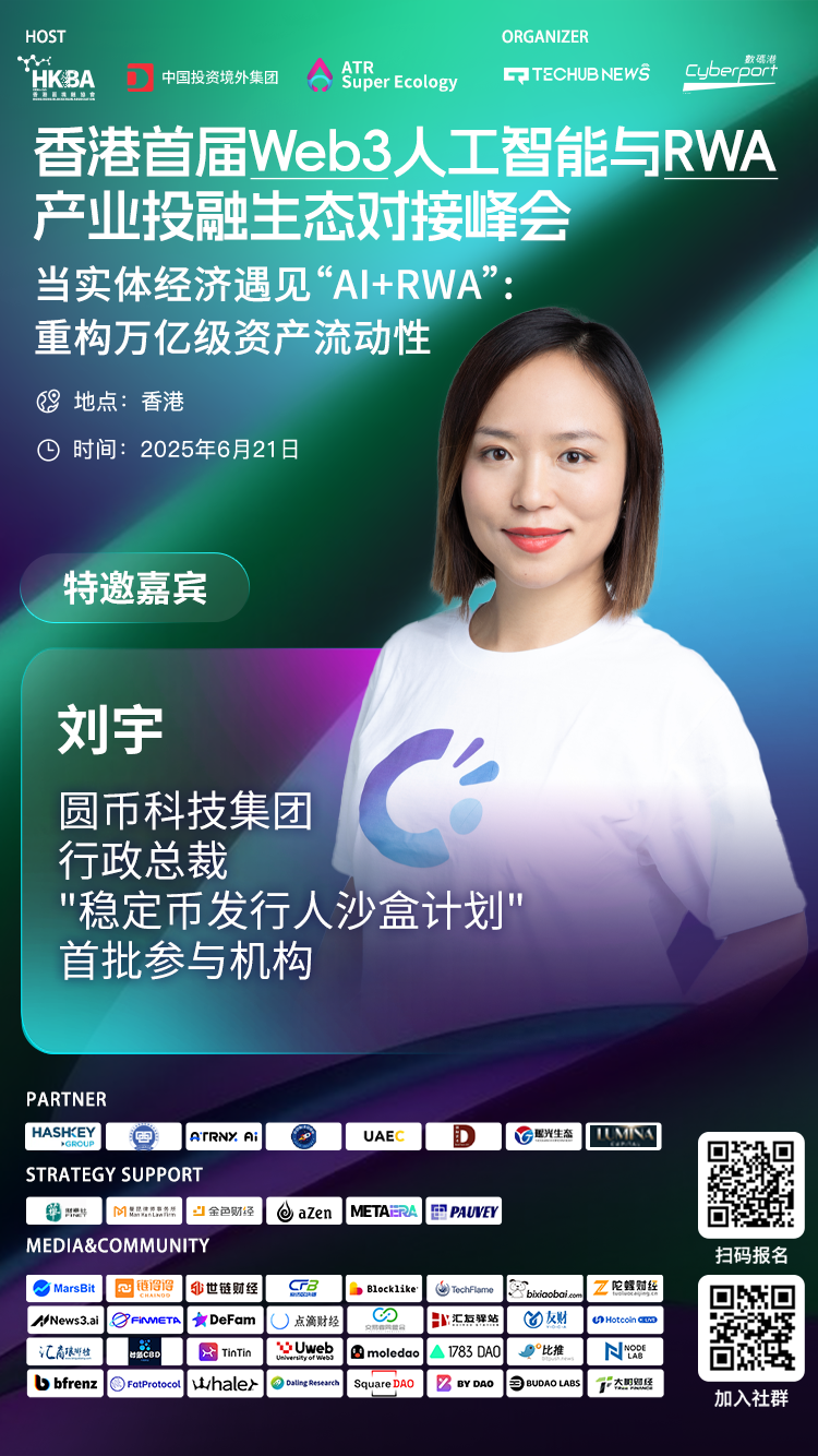 Techub News 消息,圓幣科技集團行政總裁劉宇女士確認出席 2025 年 6 月 21 日在香港舉辦的「香港 Web3 人工智能與 RWA 産業投融資生態對接峰會」。劉宇女士是國際金融科技領域公認的傑出女性領導者,在亞洲、歐洲及北美地區擁有豐富行業經驗,其業務覆蓋企業支付(B2 B)、個人支付(B2 C)、數字錢包及加密貨幣等前沿領域。圓幣科技集團作為香港金管局首批“穩定幣發行人沙盒計劃”首批參與機構,正積極探索穩定幣發行創新,其在金融科技與區塊鏈領域的洞見將為峰會帶來全球視角,助力推動 AI 與現實世界資産(RWA)的創新應用。