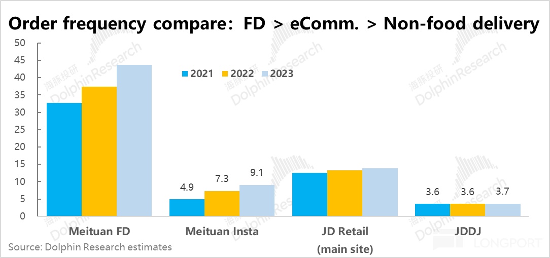 而跨細分賽道看,美團外賣的用戶年下單頻次約 45 單,京東主站的用戶下單頻次約 12~15 次,而即時零售的用戶下單頻次則在個位數區間。