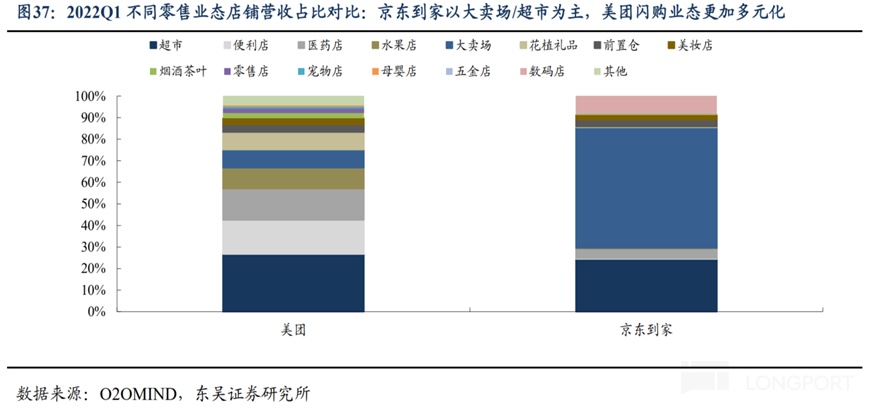 第三點原因,我們認為,正是因為京東秒送上的商品品類局限在商超商品和 3C 産品上(部分是由於京東在該類商品上有更強的心智和商家優勢)。相比之下,美團閃購的商品品類則顯著更多元化,各種商品類型和門店業態都有涉及。