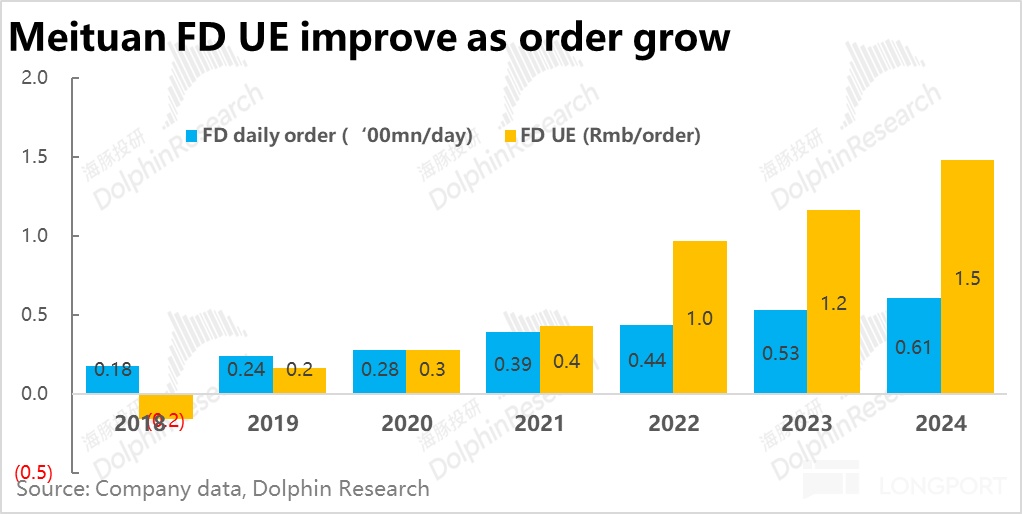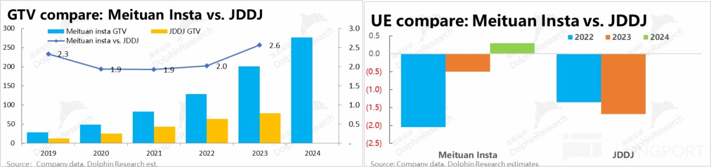 據測算 2022~24 年間,美團閃購的 UE 模型已成功扭虧為盈,而京東秒送(原名京東到家 JDDJ)到 2023 年時仍單均虧損 1 元以上。
