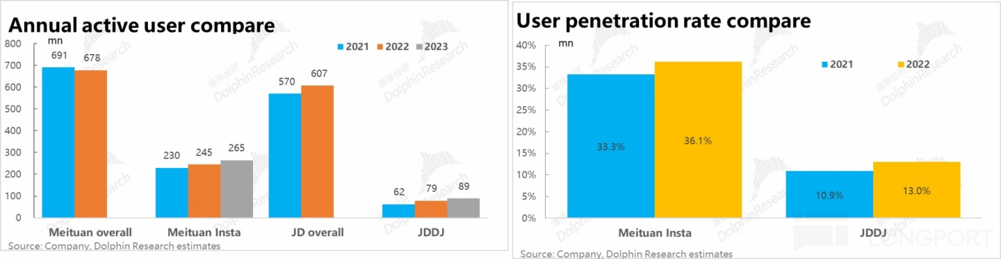 第二點,就是第一大段中海豚的一個判斷,「即時零售」 和 「餐飲外賣」 兩者間的相似度是高於其和 「遠場電商」之間的。數據上,美團和京東各自集團整體的用戶數大體相當,前者略多約 6.8 億,後者也有約 6.1 億(都為 2022 年數據),差別並不大。但美團閃購的用戶數則大約是京東秒送的約 3x。