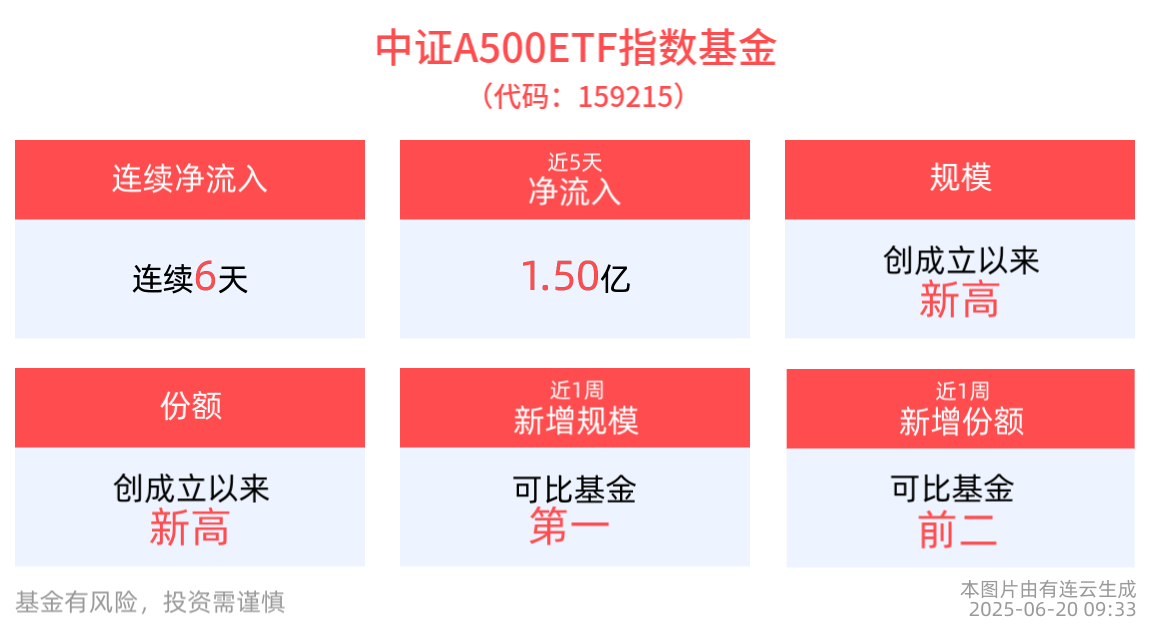 規模方面,中證A500ETF指數基金最新規模達22.69億元,創成立以來新高。