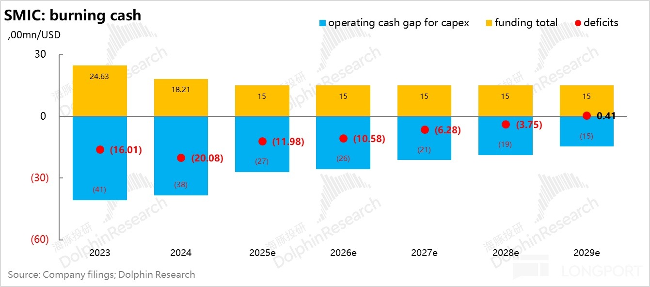 中芯國際每年要保持 70-80 億美元的年度資本開支力度,除了用每年賺到的營運現金流 + 每年 15 億淨借款來做資本投入的資金來源之外,2025 還有 12 億美金缺口,2026 年是 11 億美金。