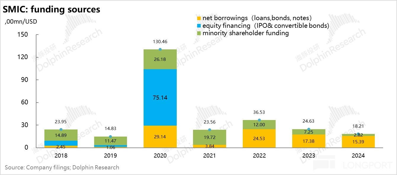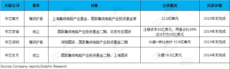 通過對 2020-2024 年關聯子公司(中芯南方、中芯京城、中芯深圳和中芯東方)的梳理,海豚君發現中芯國際在此期間設立子公司及增資擴股,大約合計籌集到 76 億美元,這數字大致與非控股股東注資數目相吻合。
