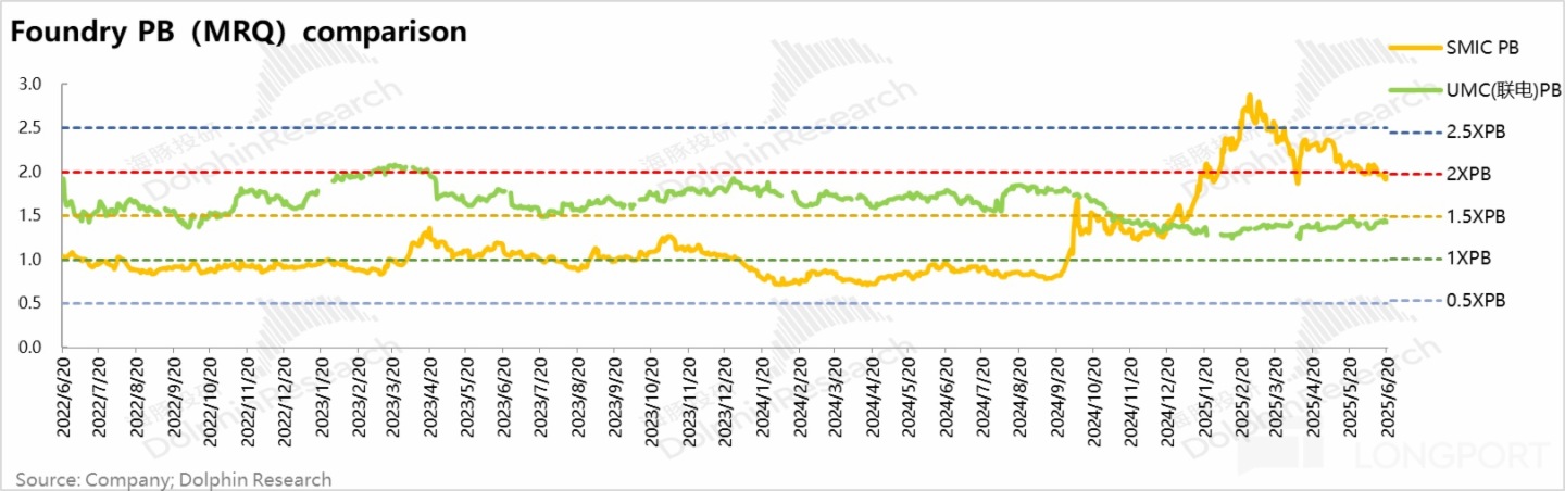在它真正起跑之前,它本質上就是一個重資産的周期生意,而周期生意本質上是 PB 估值:這類生意參考同行聯電,估值區間基於周期位置不同,多數時間是在 1-2 倍的 PB 區間内波動。