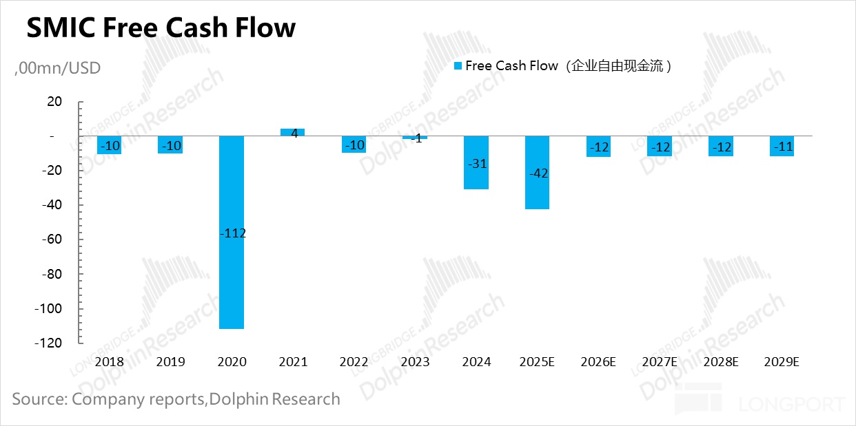 這種情況下,在海豚君磨平周期的長期預期當中,它的長期現金流預期就長成了如下情景——持續的負向自由現金流,需要持續補血。