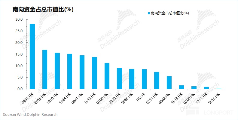也正因如此,即使是港股的中芯國際,其實願意去買的還是南下資金:中芯國際在港股市場上,南向資金佔總市值的比例已經接近 3 成,遠遠高於其他公司。