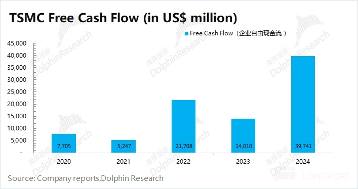 台積電維持著 200-300 億美元的年資本開支,但本身接近 400 億的經營利潤,加回股權激勵與攤銷折舊等非現金性支出後,實際可以歸屬於股東的自由現金流是規模性的正數。